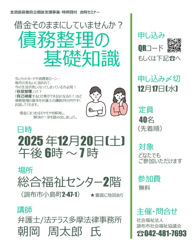 法テラス多摩法律事務所 弁護士である講師をお招きして、「任意整理」や「自己破産」についてなど「債務整理の基礎知識」についてお話いただきます。