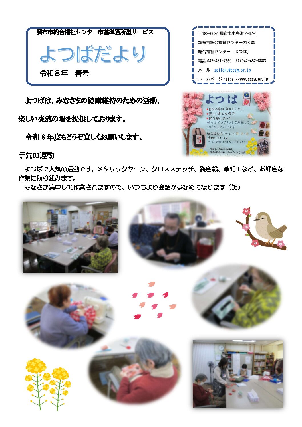 桜も咲き、令和8年度がスタートしました。 市基準通所型サービス「よつば」は楽しい活動でいっぱいです。 「よつばだより春号」ができましたので、ぜひご覧ください! 「よつば」に興味のある方は通所介護係までお問合せください。 […]