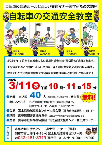 <富士見コーナー>自転車の交通安全教室 2026年4月から自転車にも交通反則通告制度(青切符)が適用されます。 主な違反行為と反則金、正しい交通ルールを調布警察署交通総務係の講師に教えていただく貴重な機会です。講座参加料は無料。知らないと損します! 開催日時 2026年3月11日(水曜日) 開始:10:00 終了:11:15 会場 富士見地域福祉センター 大集会室 調布市富士見町4丁目15番地6 主催者 調布市社会福祉協議会 市民活動支援センター富士見コーナー イベント詳細 1回完結!初めてでも絵が苦手でも簡単に描ける!(内容説明) 開催日時 2021年8月16日(日曜日) 参加費・料金 無料 定員 20 会場 染地地域福祉センター 大集会室調布市染地3-3-1 主催者 調布市地域包括支援センターときわぎ国領 イベント詳細