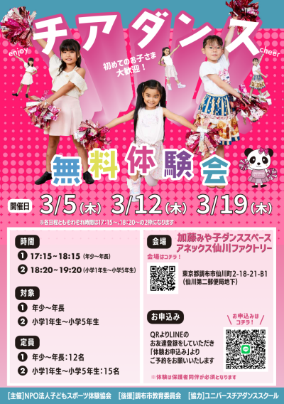 チアダンス体験会 初めてのお子様大歓迎!経験豊富な講師が基礎から丁寧に指導します。キラキラのポンポンを持ってみんなで楽しく踊りましょう! 開催日時 2026年3月5日(木曜日) 開始:17:15 終了:19:20 会場 加藤みや子ダンススペース アネックス仙川ファクトリー 調布市仙川町2-18-21-B1 イベント詳細 1回完結!初めてでも絵が苦手でも簡単に描ける!(内容説明) 開催日時 2021年8月16日(日曜日) 参加費・料金 無料 定員 20 会場 染地地域福祉センター 大集会室調布市染地3-3-1 主催者 調布市地域包括支援センターときわぎ国領 イベント詳細